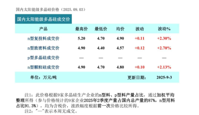 9月3日,硅业分会公布最新多晶硅价格,本周多晶硅价格全线上涨,最高涨幅为n型致密料,均价4.57万元/吨,涨幅2.7%。