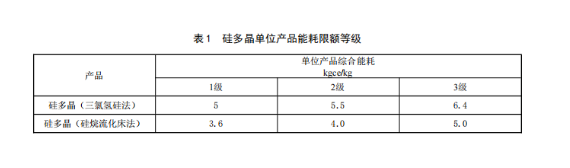 硅多晶单位产品能耗限额等级见表 1,其中 1 级能耗最低: