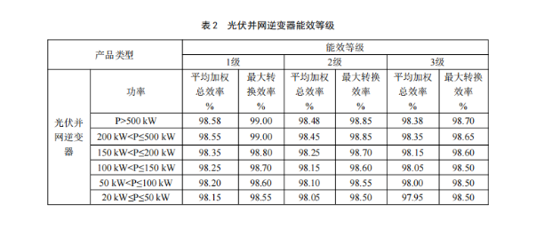 光伏并网逆变器能效等级分为3级,其中1级能效等级最高。各能效等级光伏并网逆变器的平均加权总效率和最大转换效率不应低于表2的规定。平均加权总效率与最大转换效率按GB/T 8170的规定进行修约,均保留2位小数。
