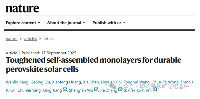 9月17日,香港城市大学Alex K.-Y. Jen,中国科学院深圳先进技术研究院张杰,岭南大学吳聖釩,吉林大学蒋青团队在期刊《Nature》发文“Toughened self-assembled monolayers for durable perovskite solar cells”。