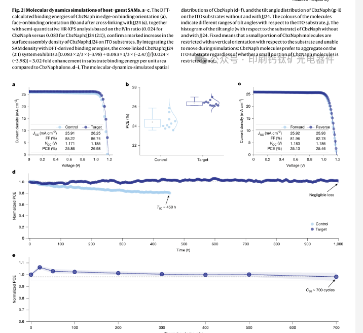 空穴选择性自组装单分子层(SAM)在将反式钙钛矿太阳能电池的认证功率转换效率提高到26.7%方面发挥了关键作用。然而,它们的不稳定性往往会损害器件的运行性能,严重阻碍其实际应用。鉴于此,香港城市大学Alex K.-Y. Jen,中国科学院深圳先进技术研究院张杰,岭南大学吳聖釩,吉林大学蒋青团队在期刊《Nature》发文“Toughened self-assembled monolayers for durable perovskite solar cells”采用可交联的co-SAM来增强空穴选择性SAM对抗外部应力的构象稳定性,同时抑制自组装过程中SAM中缺陷和空隙的形成。含叠氮化物的SAM可以被热活化,形成具有热稳定构象和择优取向的交联致密组装co-SAM。这有效地减少了热应力下松散SAM摆动造成的基底表面暴露,防止了钙钛矿分解。这使得性能最佳的电池实现了26.92%的认证效率,同时还具有出色的热稳定性,在85°C下进行1,000小时的最大功率点跟踪时,其衰减可忽略不计。在-40°C至85°C之间进行700次重复热循环后,它仍能保持初始效率的98%以上,代表了该领域的最先进水平。这项工作深入了解了SAM的退化机制,以指导为采用高粗糙度衬底的基于SAM的器件设计更坚固的掩埋界面,从而实现高效耐用的钙钛矿太阳能电池。