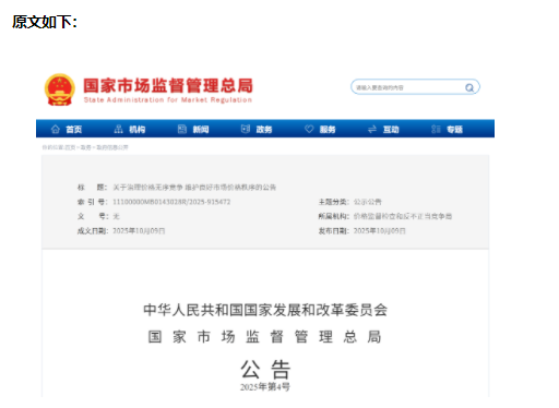 10月9日,国家发展改革委、市场监管总局发布《关于治理价格无序竞争 维护良好市场价格秩序的公告》。