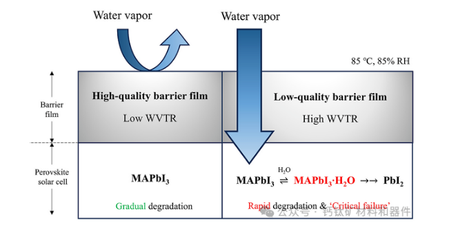 众所周知,PSCs对环境因素如紫外线照射、高温和湿度高度敏感,这些因素显著加速器件的劣化,从而缩短其寿命。在这些因素中,由于钙钛矿层本身的固有不稳定性,湿度对组件效率的影响尤为严重。大量研究对器件劣化的原因及其机制进行了详细探讨,以解决稳定性问题。一般而言,湿度会显著导致功率输出和短路电流(ISC)下降,这是由于钙钛矿层分解为PbI₂ 和甲基铵卤化物作为最终产物。在存在湿度的情况下,与电子传输层(ETL)相邻的钙钛矿层比与空穴传输层(HTL)相邻的钙钛矿层快速降解,这是由于空穴载流子浓度过高而非电子浓度过高。高湿度和高温暴露会导致严重的填充因子(FF)损失,并通过形成分离的平面 PbI2出现典型的 S 形 I-V 曲线。此外,在采用氧化镍作为空穴传输层(HTL)的 PSCs中,也发现了 S 形的 I-V 特性,这是由于在潮湿热应力测试中NiOx/钙钛矿界面处的能带错位。利用甲脒 (FA) 和/或铯 (Cs) 基钙钛矿等新兴材料在 PSCs稳定性方面的进展已被广泛研究。然而,在本研究中,作者选择了甲基铵碘化铅 (MAPbI3) 作为活性材料,该材料具有较高的光电转换效率(PCE)和被充分理解的性质,使其成为对比研究的有效起点。团队的先前研究广泛研究了湿度对基于 MAPbI3的 PSCs微型组件在 85°C 和 85% 相对湿度(RH)潮湿热(DH)条件下寿命的影响,并与 70–105°C 的热加速测试进行比较。在湿润条件下,钙钛矿活性层的降解成为主导失效模式,这是由于 PbI2的形成,而空穴传输层(HTL,即spiro-OMeTAD)的降解则发生在热条件下。在本文中,对 MAPbI3模块在相同 DH 条件下的效率下降及其降解机制进行了更深入的理解。通过改变封装膜的水蒸气透过率(WVTR)并使用小间隔来观察其寿命期间的细微降解,系统地研究了估算水渗透对电性能和相稳定性的影响。此外,水分渗透导致模块效率损失及中间相形成的作用已被广泛讨论。这些研究结果提供了对室内和室外测试中柔性 PSCs湿度相关降解路径的全面理解。