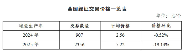 2025年10月,电量生产年为2024年的绿证单独交易平均价格2.56元/个,电量生产年为2025年的绿证单独交易平均价格5.22元/个。