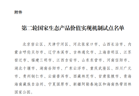 为深入贯彻党的二十大和二十届历次全会精神,认真落实党中央、国务院决策部署,加快推进中共中央办公厅、国务院办公厅《关于建立健全生态产品价值实现机制的意见》重点任务落实,经部门推荐、征求地方意见等程序,确定北京市密云区等25个地区和海南热带雨林国家公园为第二轮国家生态产品价值实现机制试点,试点期限为2026-2028年。现将第二轮试点名单予以公布,并就有关事项通知如下: