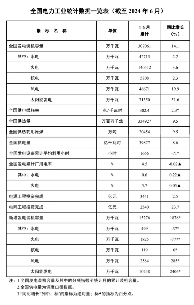 截至6月底,全国累计发电装机容量约30.7亿千瓦,同比增长14.1%。其中,太阳能发电装机容量约7.1亿千瓦,同比增长51.6%;风电装机容量约4.7亿千瓦,同比增长19.9%。