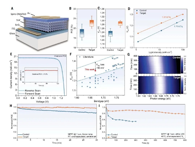 研究团队通过Rb⁺离子的A位掺杂策略,成功将带隙为1.67 eV的宽带隙钙钛矿器件开路电压提升至1.30 V,创下该类器件的纪录。同时,该策略显著抑制了光致相分离现象,在连续400分钟一个太阳光照条件下,未观察到明显相分离,表现出优异的光照稳定性。