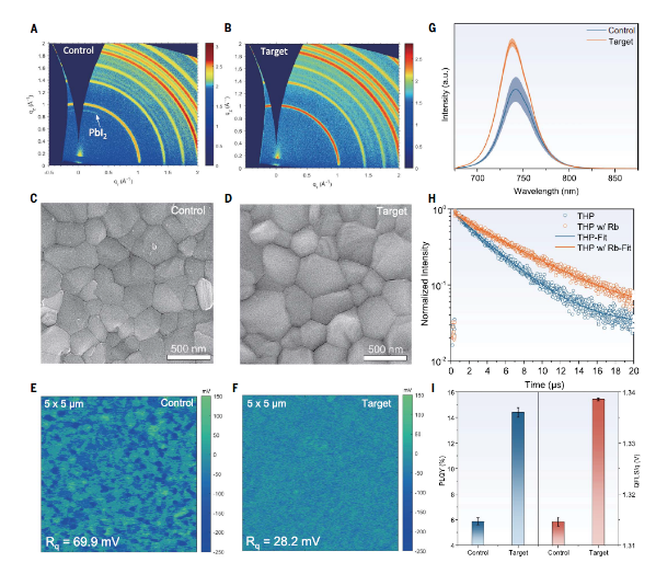 多尺度材料表征,阐明了Rb+掺杂在改善钙钛矿薄膜面内以及面外方向上组分均匀性中的核心作用。进一步通过荧光量子产率测试,观察到Rb+掺杂大幅增强了宽带隙钙钛矿的准费米能级分裂,揭示了器件开路电压的提升机理。