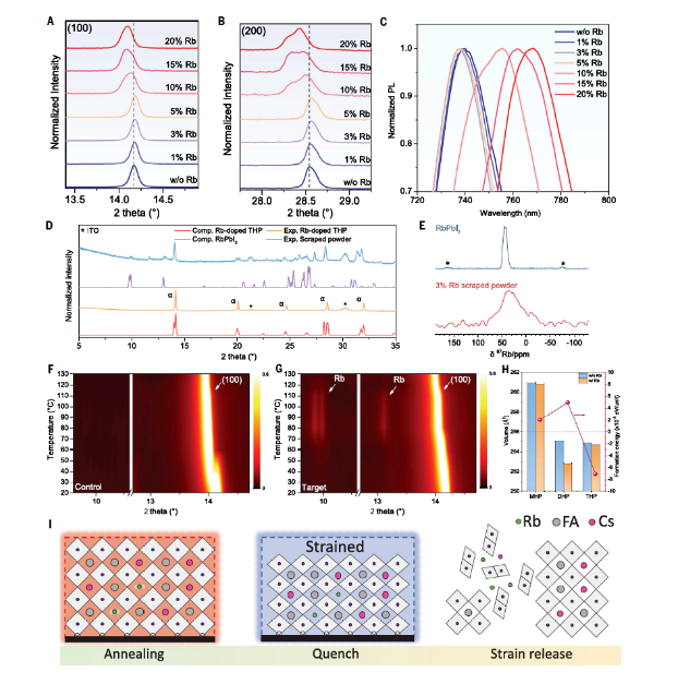 该成果突破传统基于容忍因子的阳离子掺杂设计范式,利用钙钛矿薄膜材料的晶格应变,将尺寸小于容忍因子下限的Rb+离子嵌入钙钛矿晶格中,从而提升元素分布的均匀性,有效提高离子迁移势垒,抑制相分离的发生。