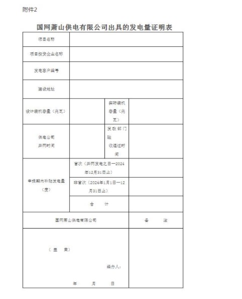 3.国网萧山供电有限公司或所属供电所出具的发电量证明(见附件2)、分布式电源客户电费结算清单(需供电公司盖章,要求纸质盖章原件)。