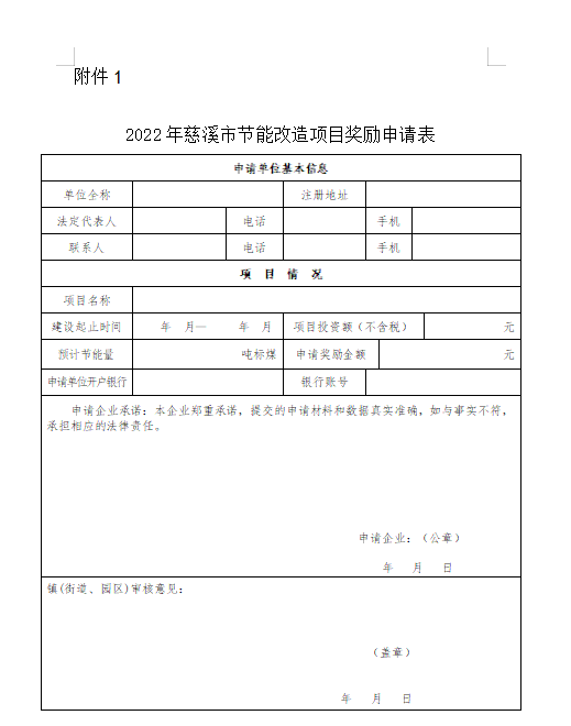 1.2022年慈溪市节能改造项目奖励申请表(附件1);