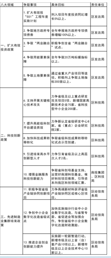 上述8个领域政策由区财政2024年预算安排资金。各领域政策区级牵头单位要根据文件要求,会同财政金融、自然资源、能源、人才等要素保障单位,抓紧出台配套政策文件,及时做好政策的宣传解读、责任分解和落地实施。各镇(街道)要充分配合,发挥属地主体作用,推动政策精准滴灌、直达快享,确保基层有感、群众获益、企业得利。