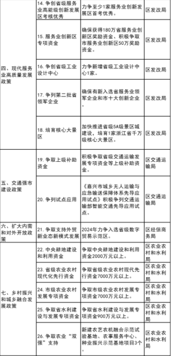 (二十九)支持打造服务业重点平台。推动嘉兴科技城检验检测服务业集聚区、嘉兴电商产业园“国字号”平台建设;深入推进3个省级、1个市级现代服务业创新发展区建设,积极争创省级服务业高能级创新发展区。优先推荐现代服务业创新发展区内企业申报省级服务业专项资金,积极争取省、市服务业创新发展区奖励资金。在年度新增建设用地计划指标分配中,优先安排现代服务业创新发展区建设用地。深入推进楼宇经济提质增效、开展强镇竞赛,加大力度支持各镇街打造具有辨识度和竞争力的差异化服务业发展平台,积极争取市服务业高质量发展强镇(街道)奖励资金。(责任单位:区发改局、区自然资源和规划分局)
