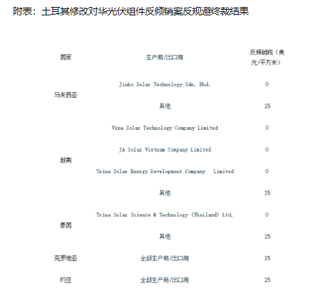 2024年9月27日,土耳其贸易部发布第2024/30号公告,修改对原产于中国的光伏组件(土耳其语:bir modül halinde birleştirilmiş veya panolarda düzenlenmiş fotovoltaik hücreler)反倾销案反规避终裁结果,豁免马来西亚、泰国和越南部分企业反倾销税(详见附表)。涉案产品包括光伏电池组件和太阳能电池板,涉及土耳其税号8541.43.00.00.00项下的产品。措施公告自发布之日起生效。